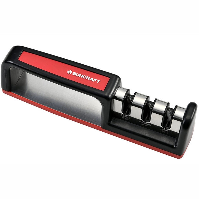 TRÈS SIMPLE D'UTILISATION. POSSÈDE 3 FENTES DIFFÉRENTES: GROSSE, MOYENNE ET FINE. LA FENTE LARGE PERMET D'AFFÛTER LES COUTEAUX ÉMOUSSÉS. LES RAINURES MOYENNES ET FINES PEUVENT ÊTRE UTILISÉES POUR AFFINER VOS COUTEAUX. NE VA PAS AU LAVE-VAISSELLE.