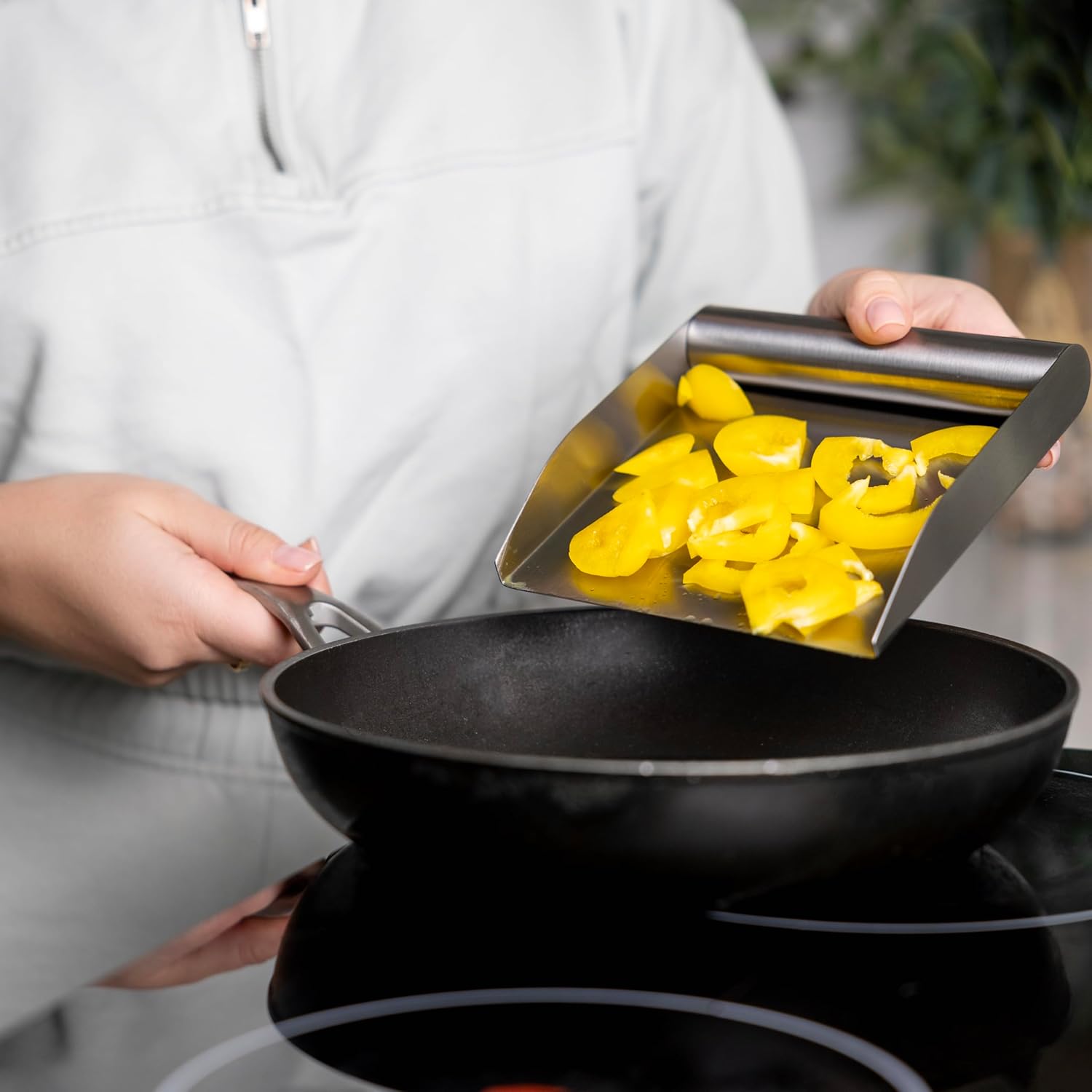 - Ramassez et déplacez les aliments : ramassez et transportez des fruits hachés, des légumes, de la viande et plus encore de vos planches à découper aux poêles et assiettes avec ce gadget de cuisine pratique. La tête de la pelle à large ouverture et les parois latérales hautes permettent de ramasser facilement les aliments et de les garder en sécurité.