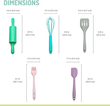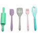 ENS. (5) MINI OUTILS EN SILICONE. COMPREND ROULEAU À PÂTISSERIE, SPATULE À MÉLANGER, PINCEAU À PÂTISSERIE, SPATULE À RETOURNER ET FOUET