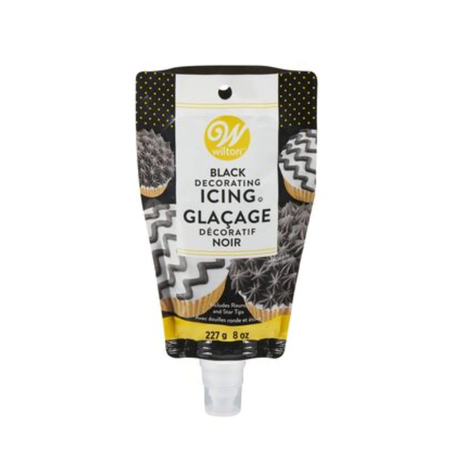 GLAÇAGE DÉCORATIF NOIR DE 8 OZ.. COMPREND UNE DOUILLE RONDE ET UNE ÉTOILE POUR BISCUITS ET CUPCAKES