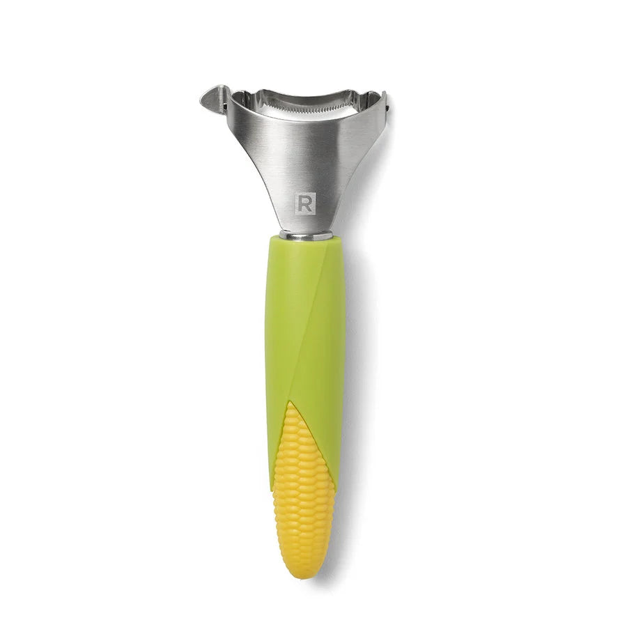 LAME COURBÉE ET DENTELÉE POUR ÉGRENER LE MAÏS RAPIDEMENT ET EN TOUTE SÉCURITÉ. OUTIL INTÉGRÉ POUR ÉPLUCHER LES ÉPIS DE MAÏS PLUS FACILEMENT. LAME TRANCHANTE EN ACIER INOX. PARFAIT POUR LA MISE EN CONSERVE, LES SALADES, LA SALSA, ETC. VA AU LAVE-VAISSELLE